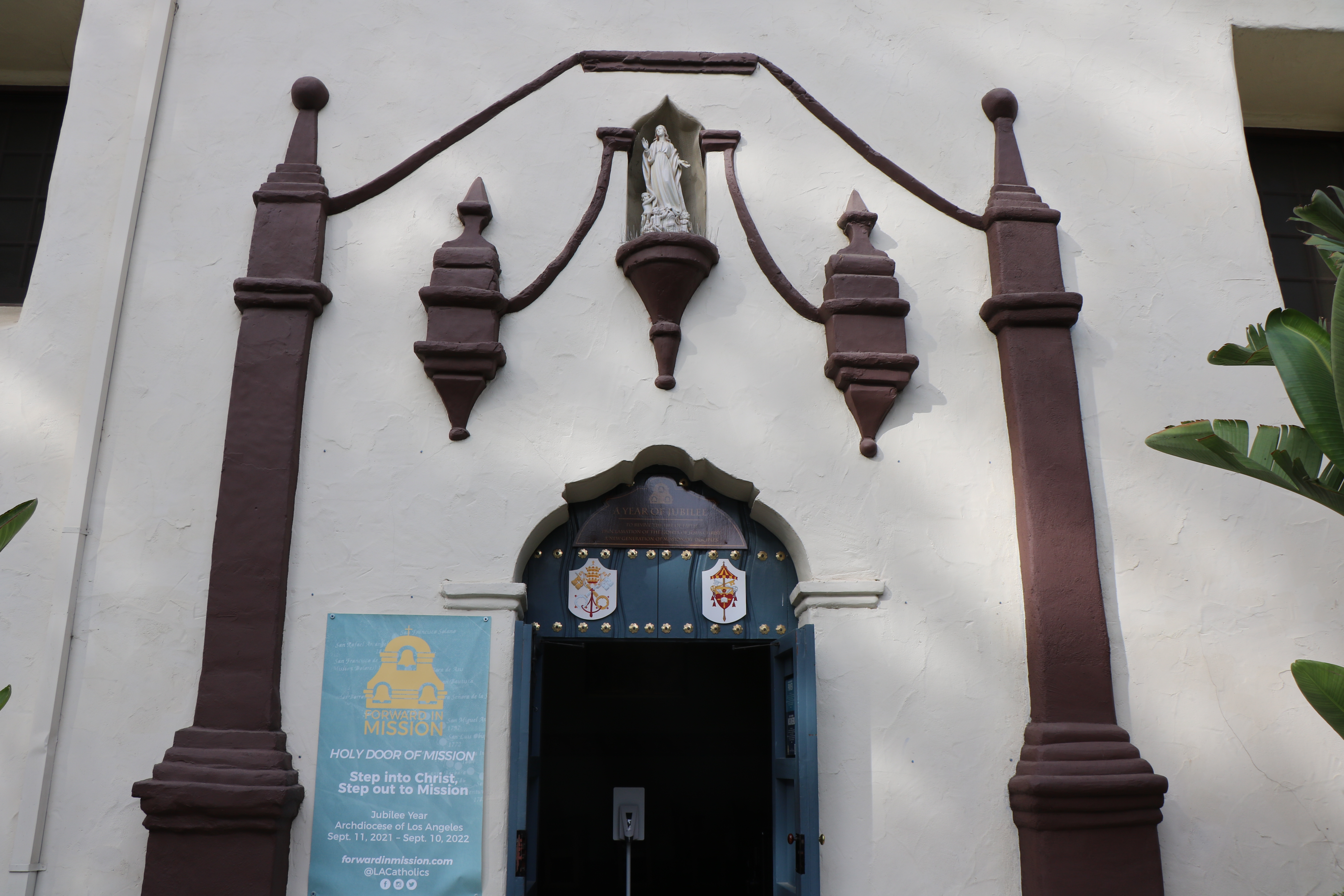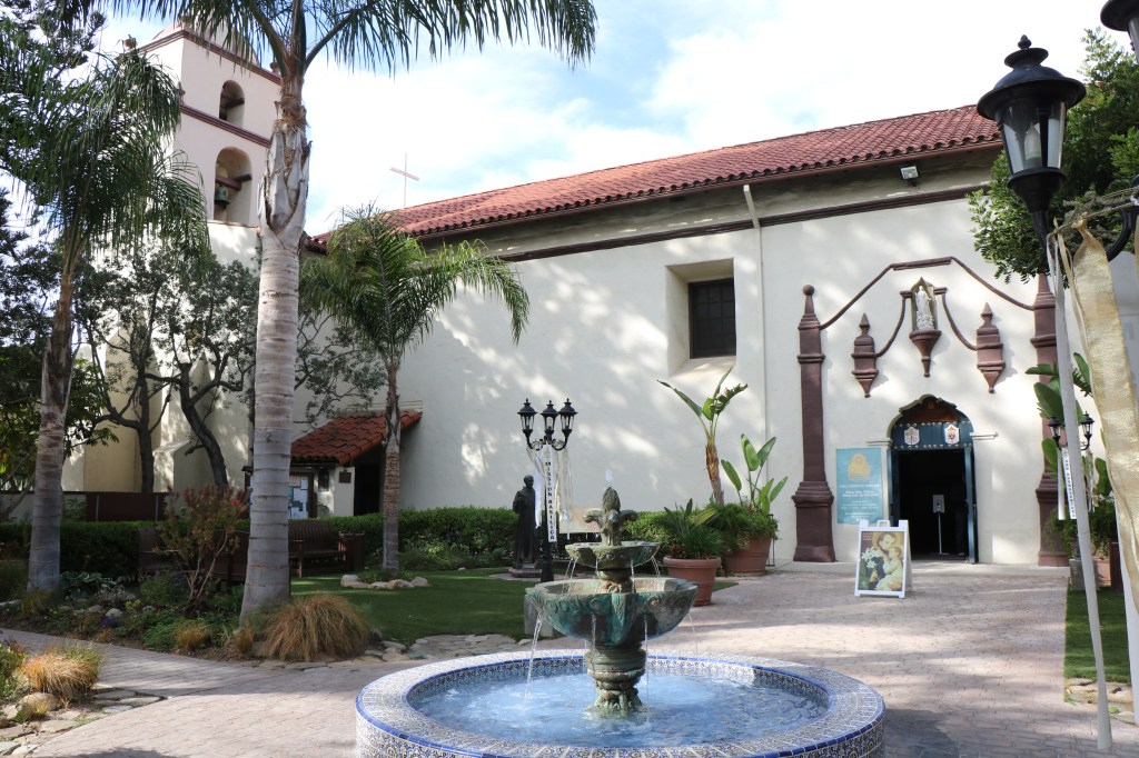 The inviting courtyard has a varied array of plants and a fountain in the middle. There are palms, bougainvillea, potted plants and a statues of Mary, Saint Francis, and Father Serra.
