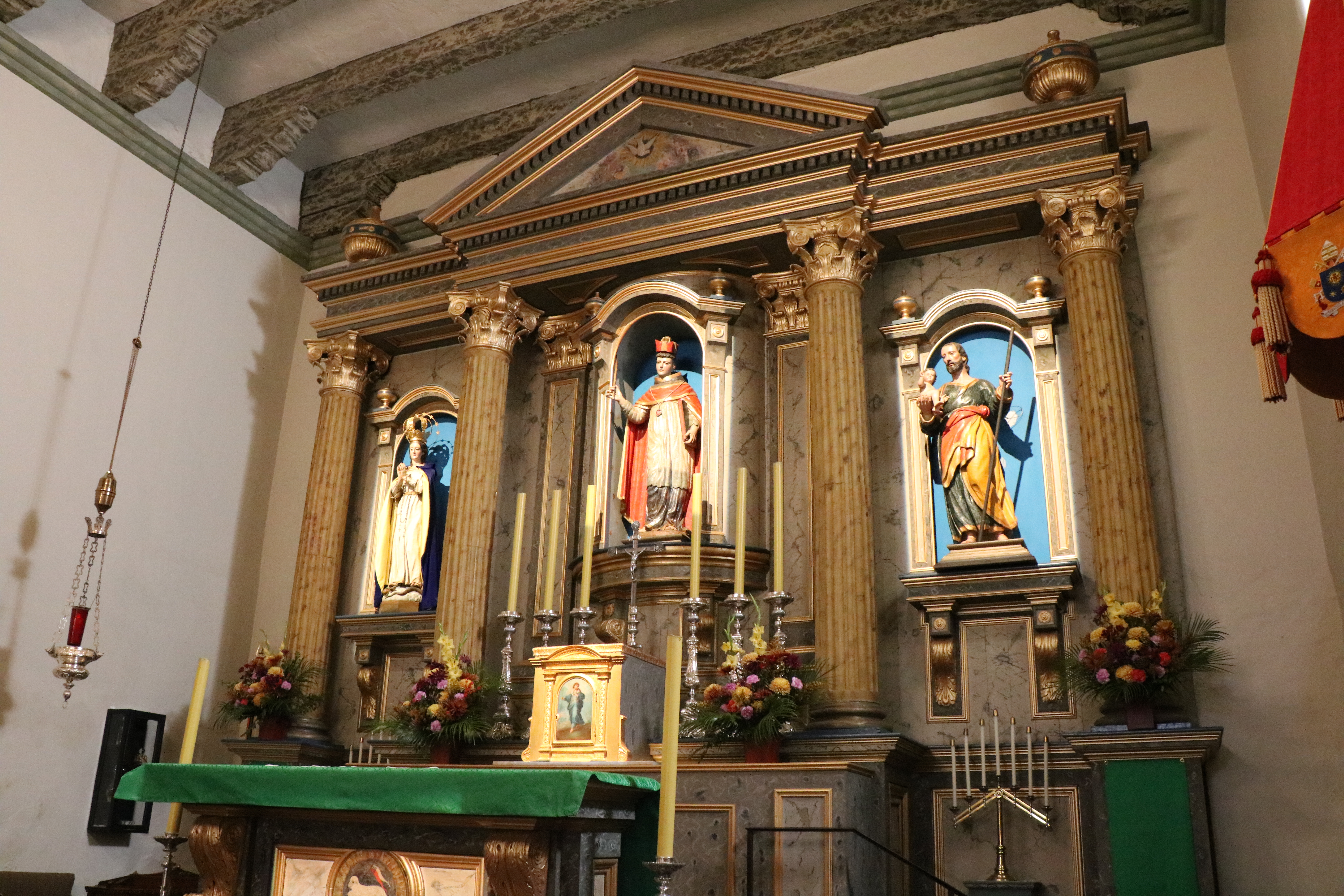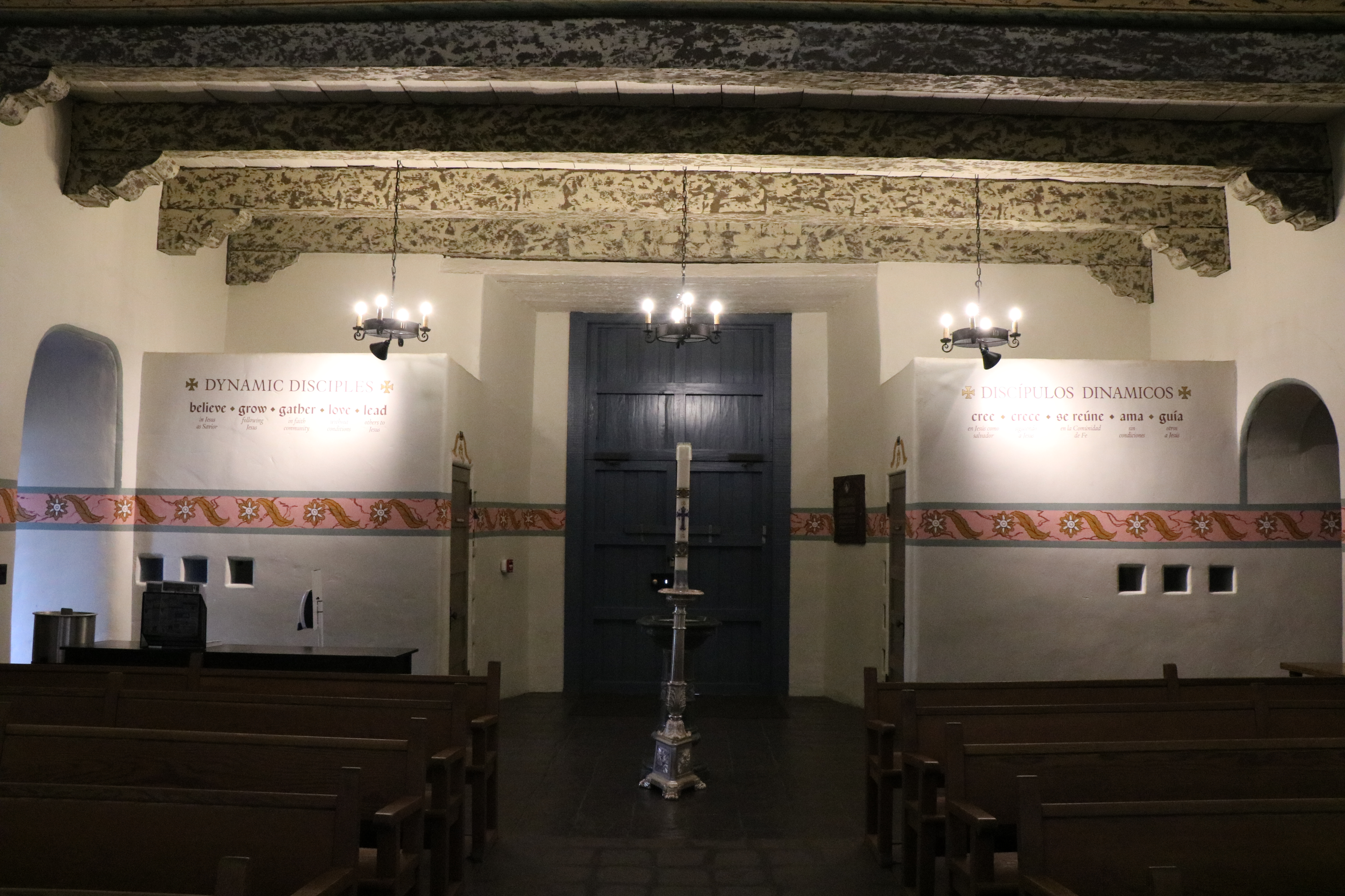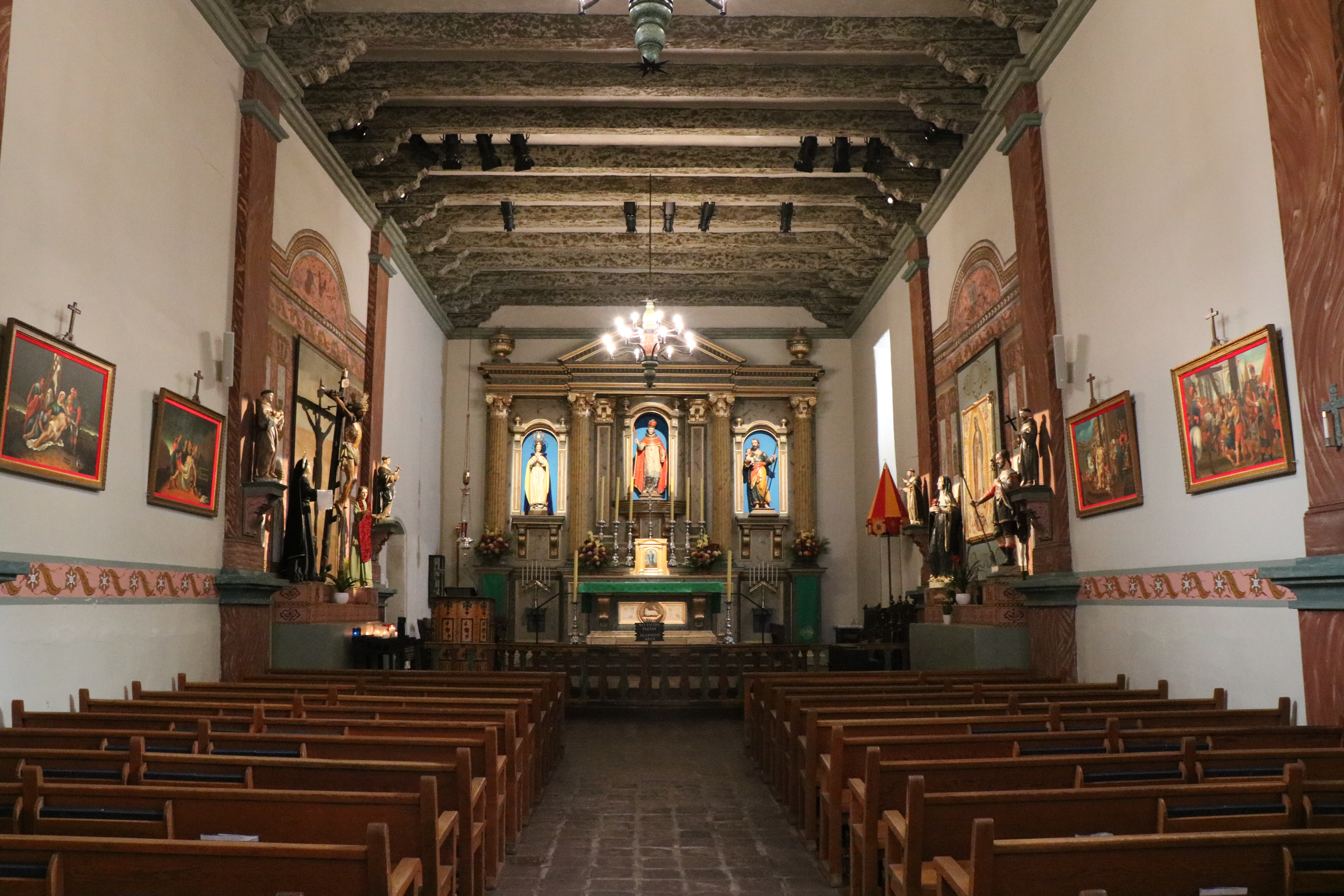 The beautiful church has walls painted in shades of pink and brown. Mottled green ceiling beams standout and there are wooden chandeliers. The alter features statues of Mary, San Buenaventura, and Joseph all set in front of a blue background