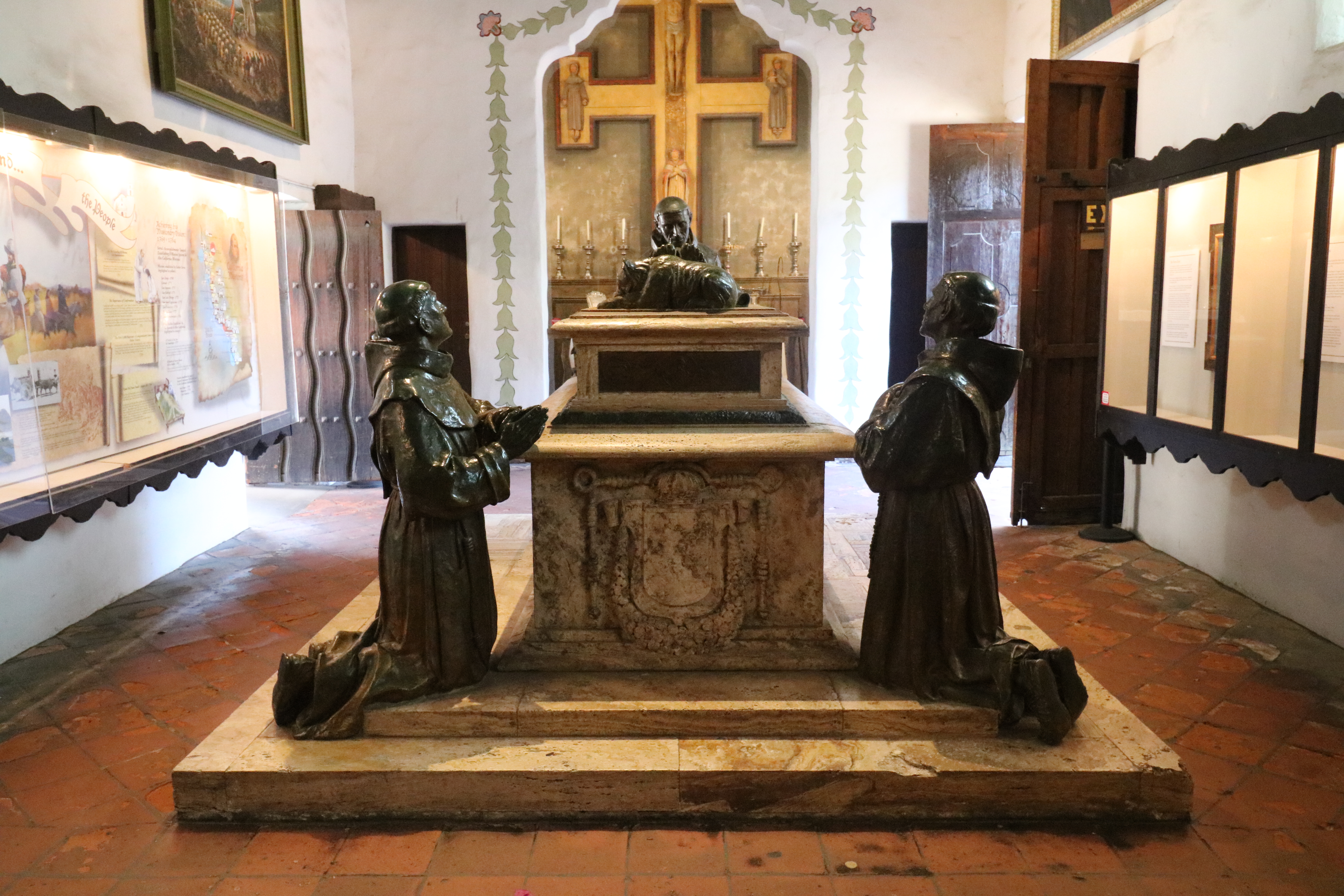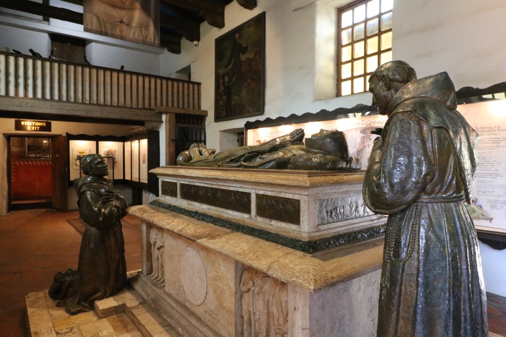 The Serra Memorial Cenotaph is a 1924 monument showing Fr. Crespi, Fr. Lasuén and Fr. Julian Lopez praying around the body of Fr. Serra whose feet, oddly enough, are resting upon a grizzly bear cub. It is in the first room of an excellent museum.