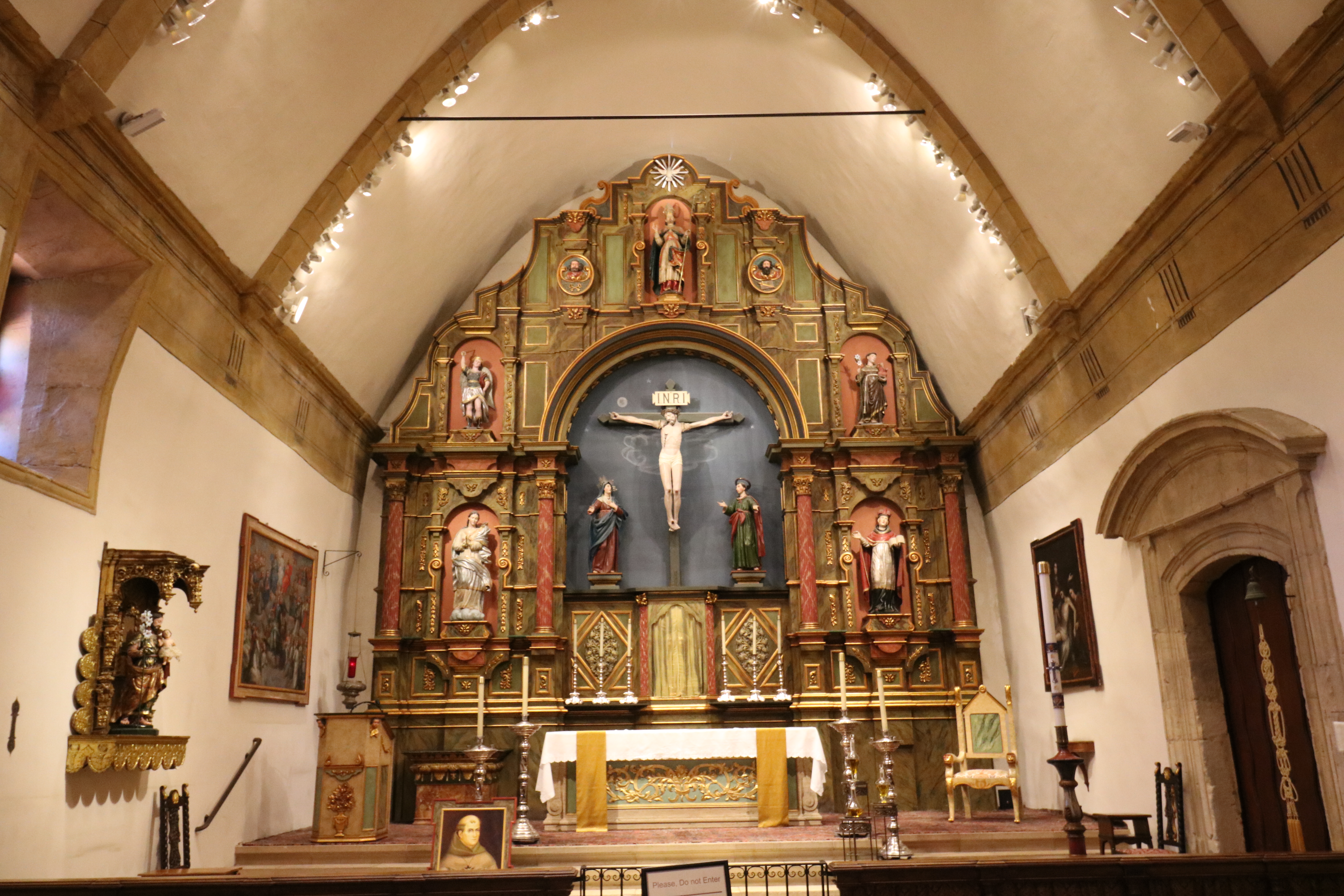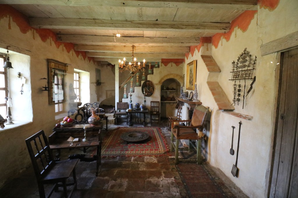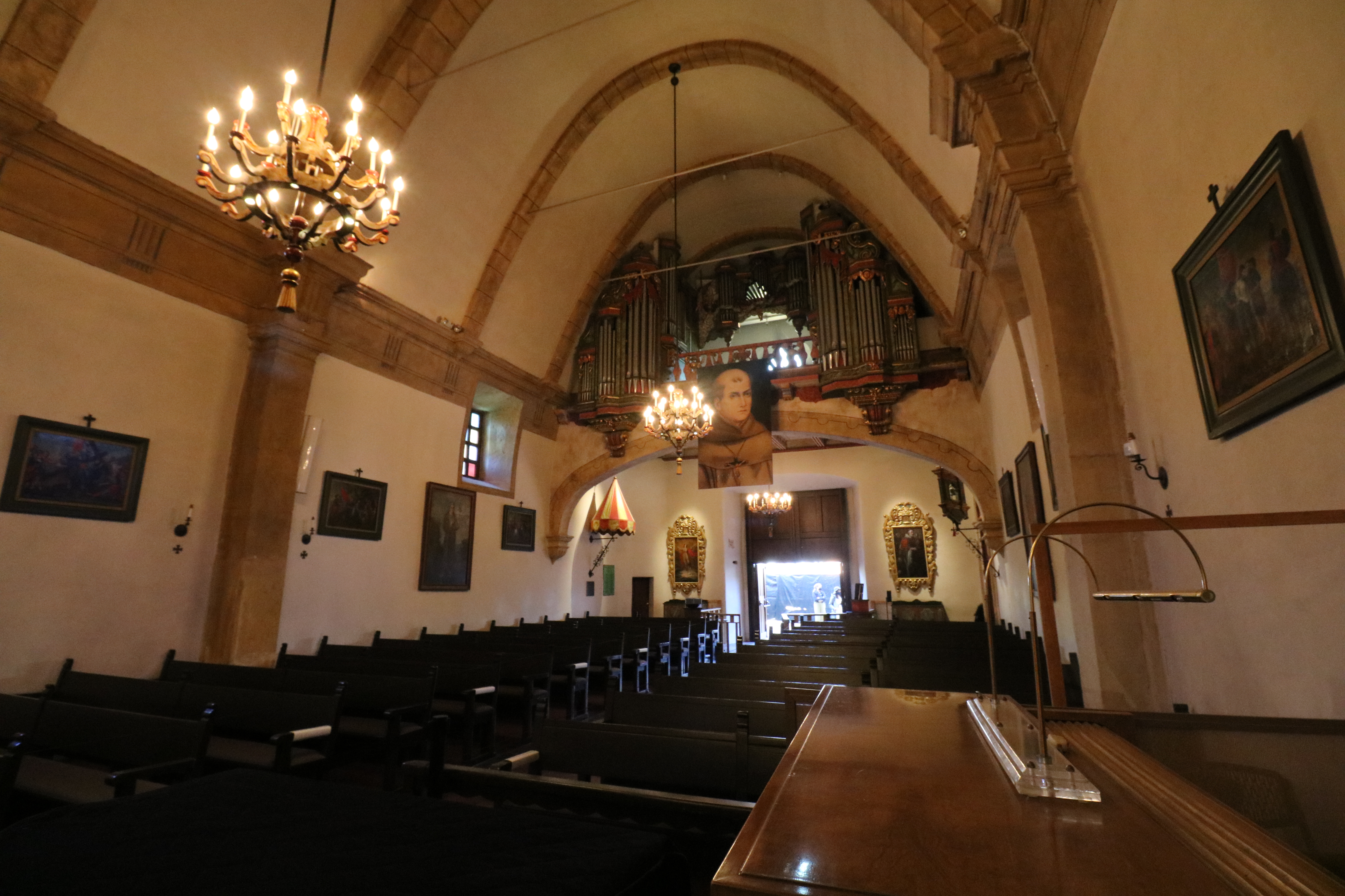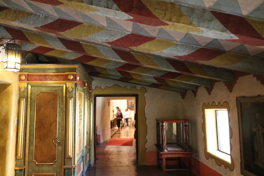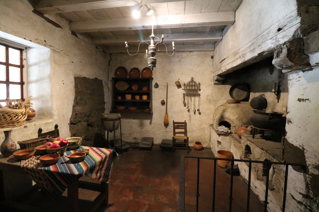 This is the restored padres’ quarters with tiled floors, frescos near the ceiling, and period details. There is a painting of Gaspar de Portolá, first governor of Alta California, underneath the stairs.