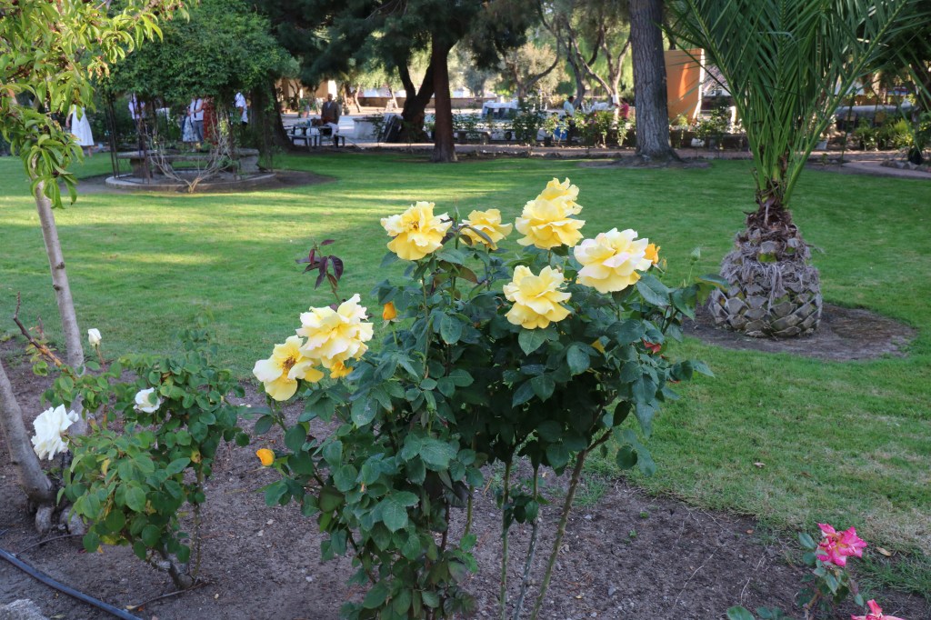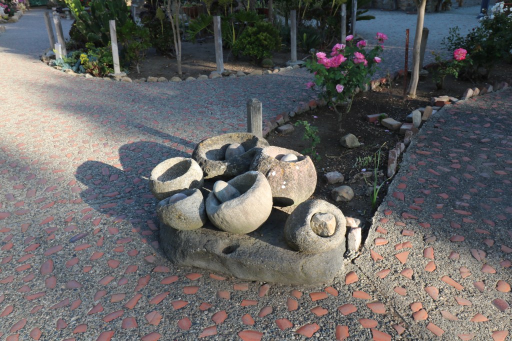 The large garden is spectacular with a variety of plants and succulents. There are many roses and palms and a large hanging church bell.