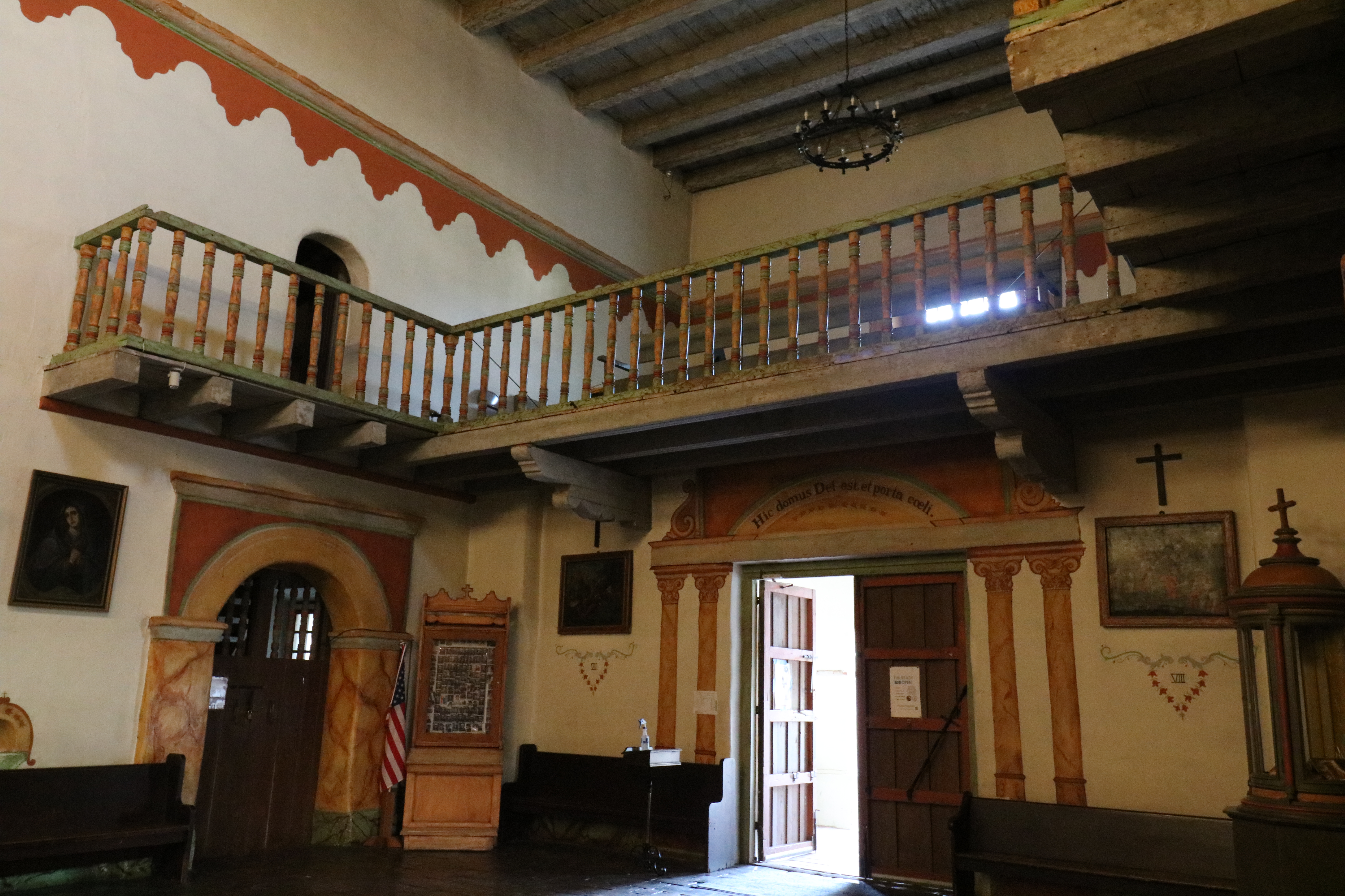 This is the largest mission church in the chain, and it is the only church with three aisles. Red and yellow frescos are painted on the columns and above the arches that separate the aisles.