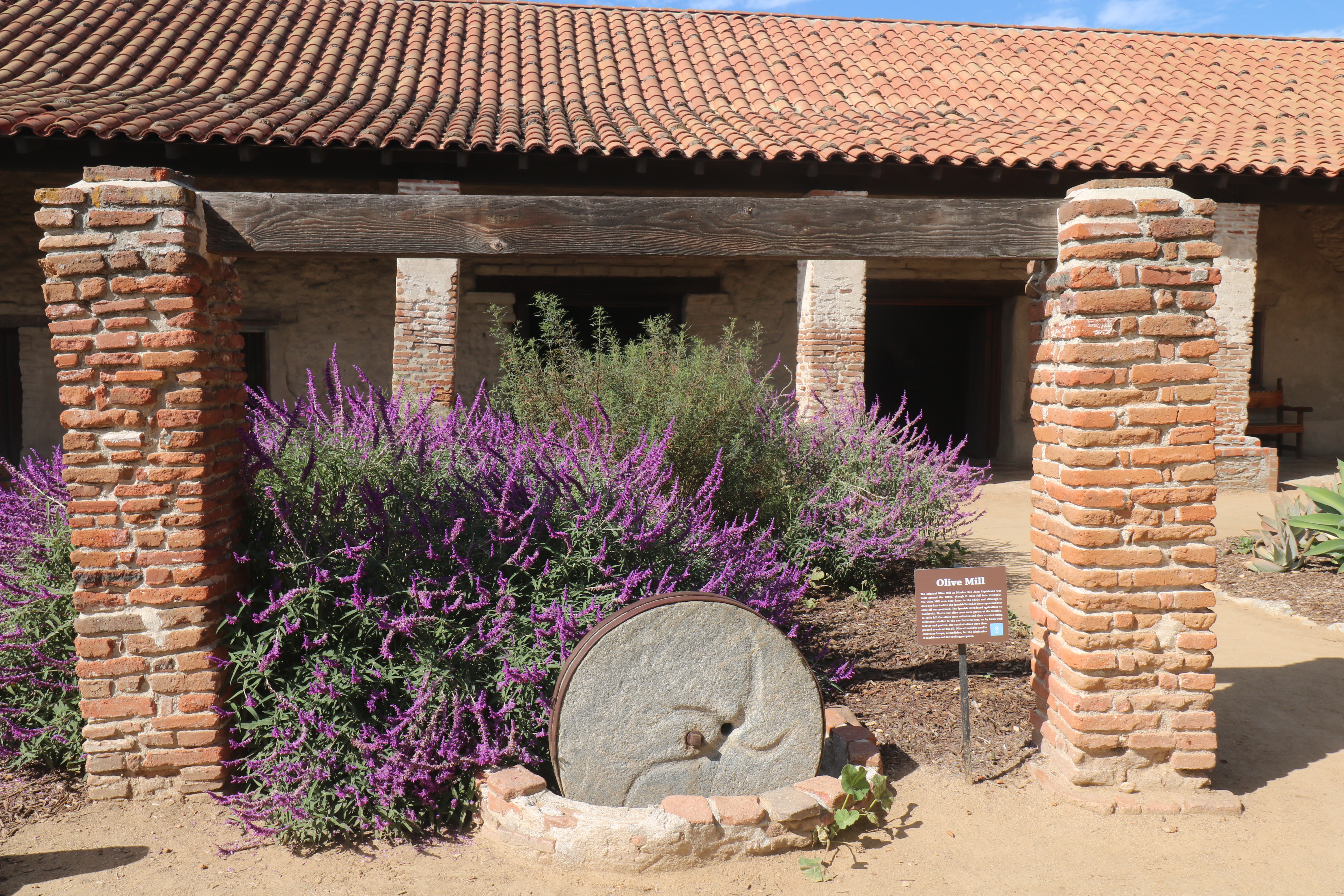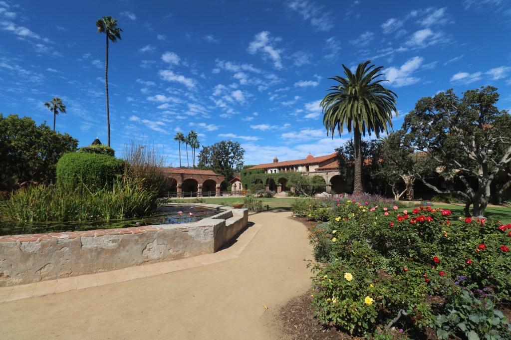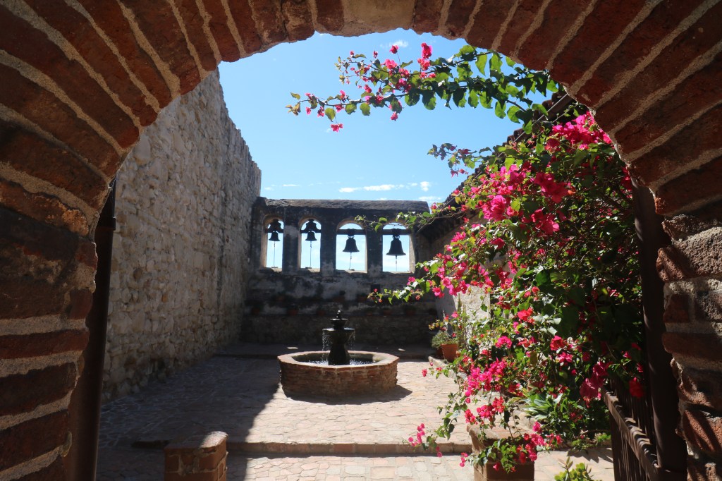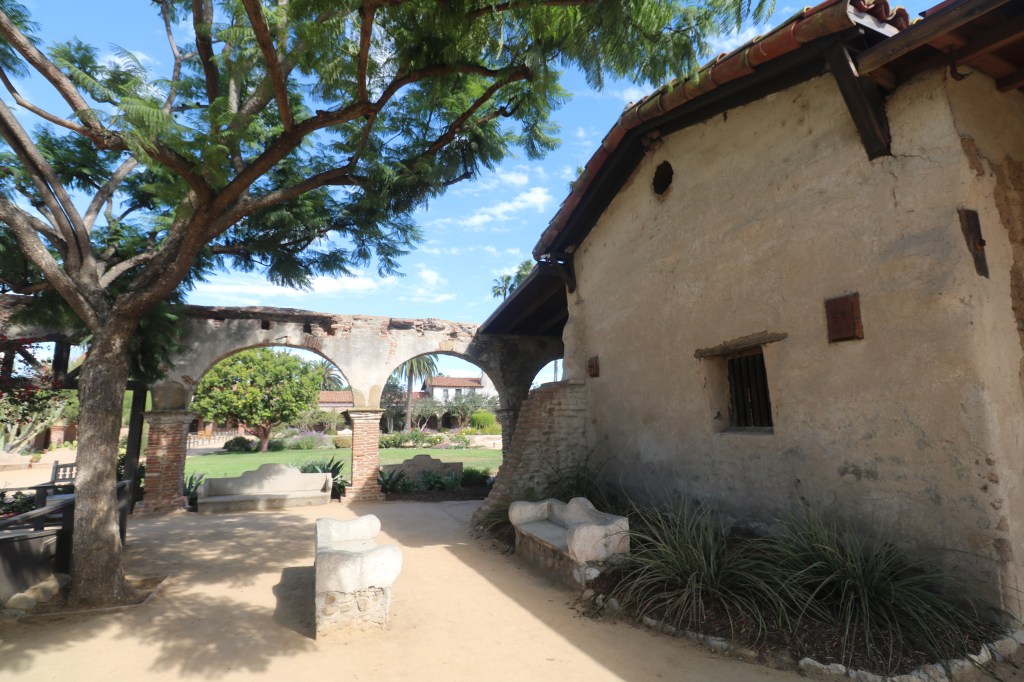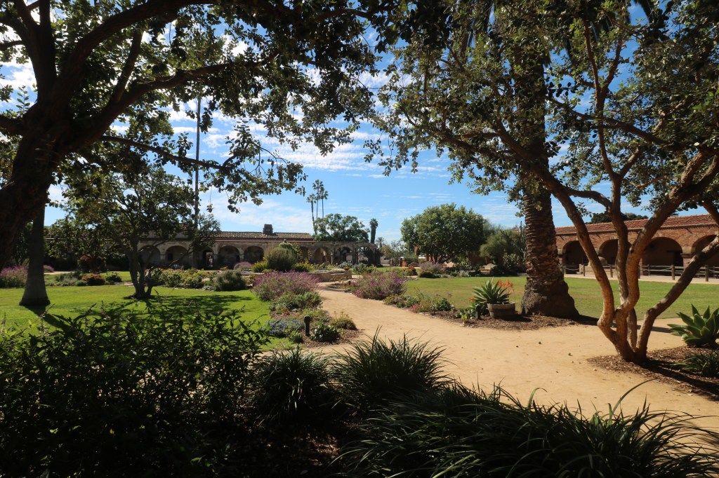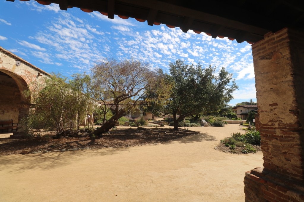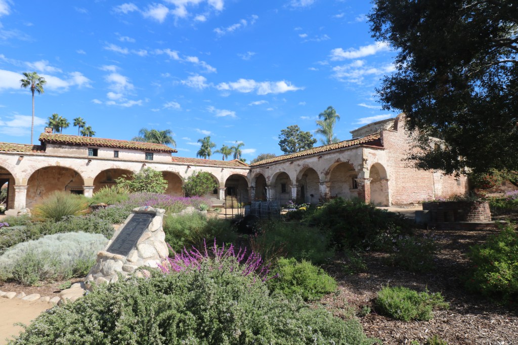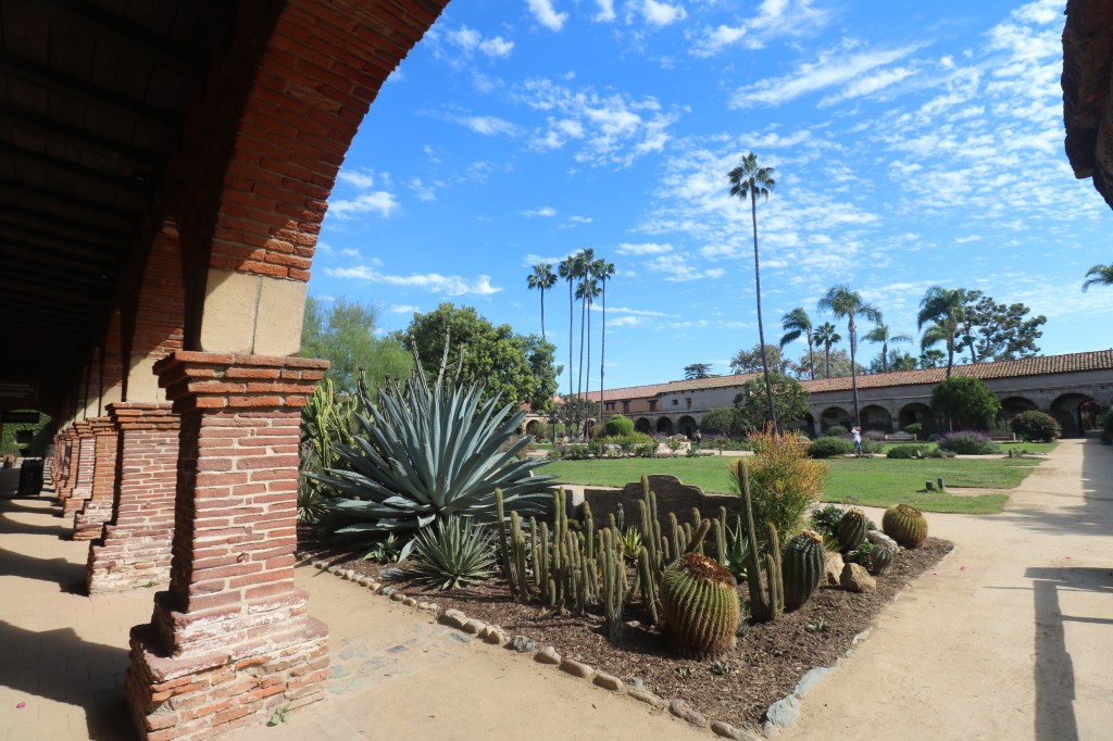 The gardens and plantings set against the cloister are stunning, the most beautiful in the mission system. There are many varieties of succulents, colorful bougainvillea, roses, palm trees, oaks and on and on.