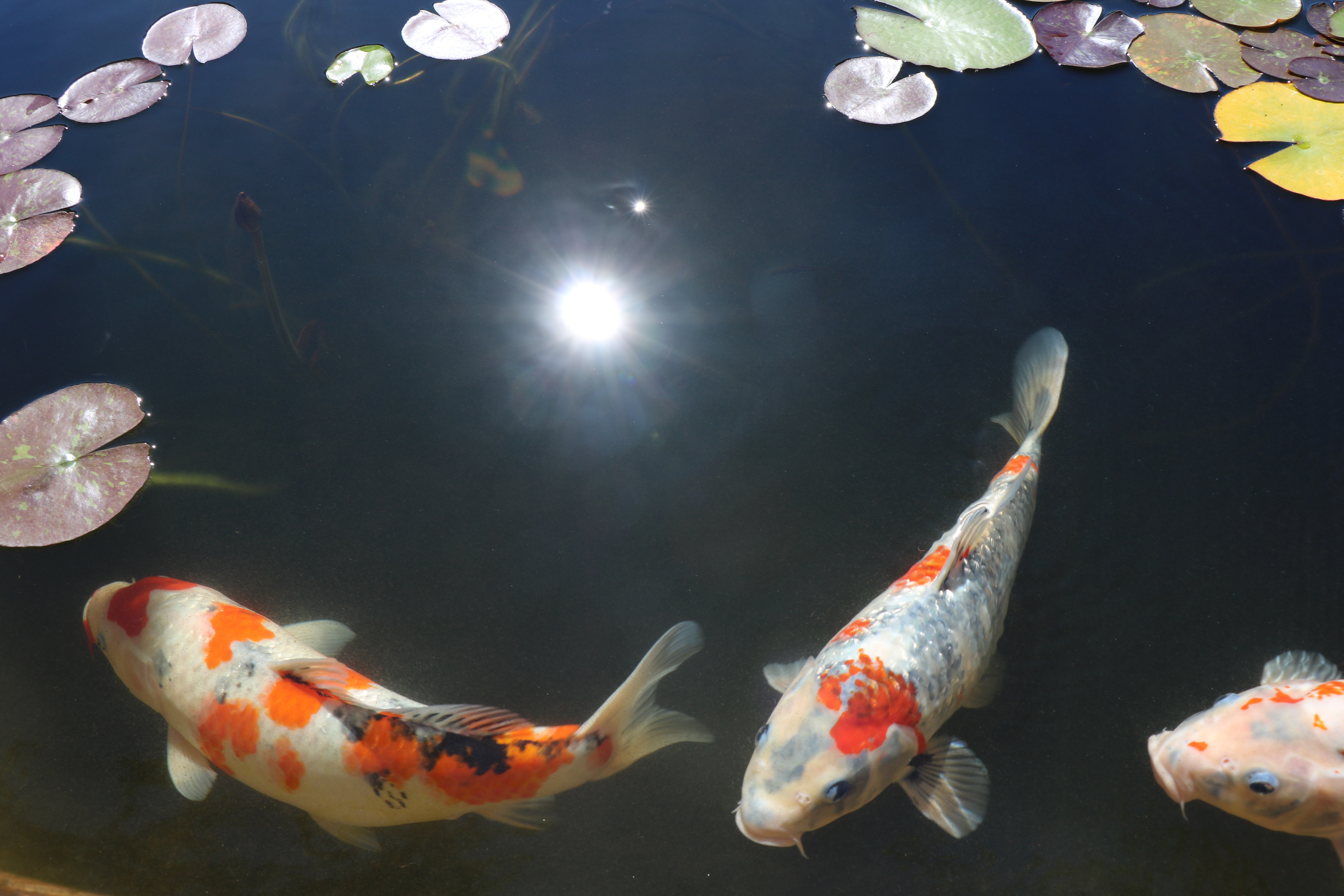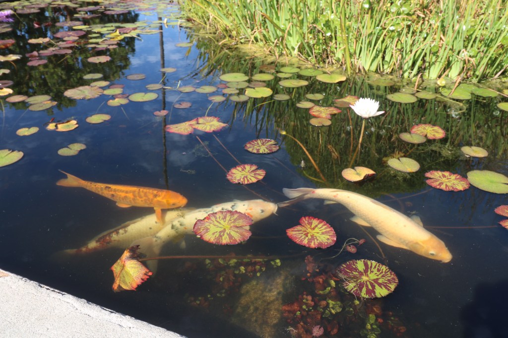 The large stone fountain is teeming with colorful koi and water lilies.