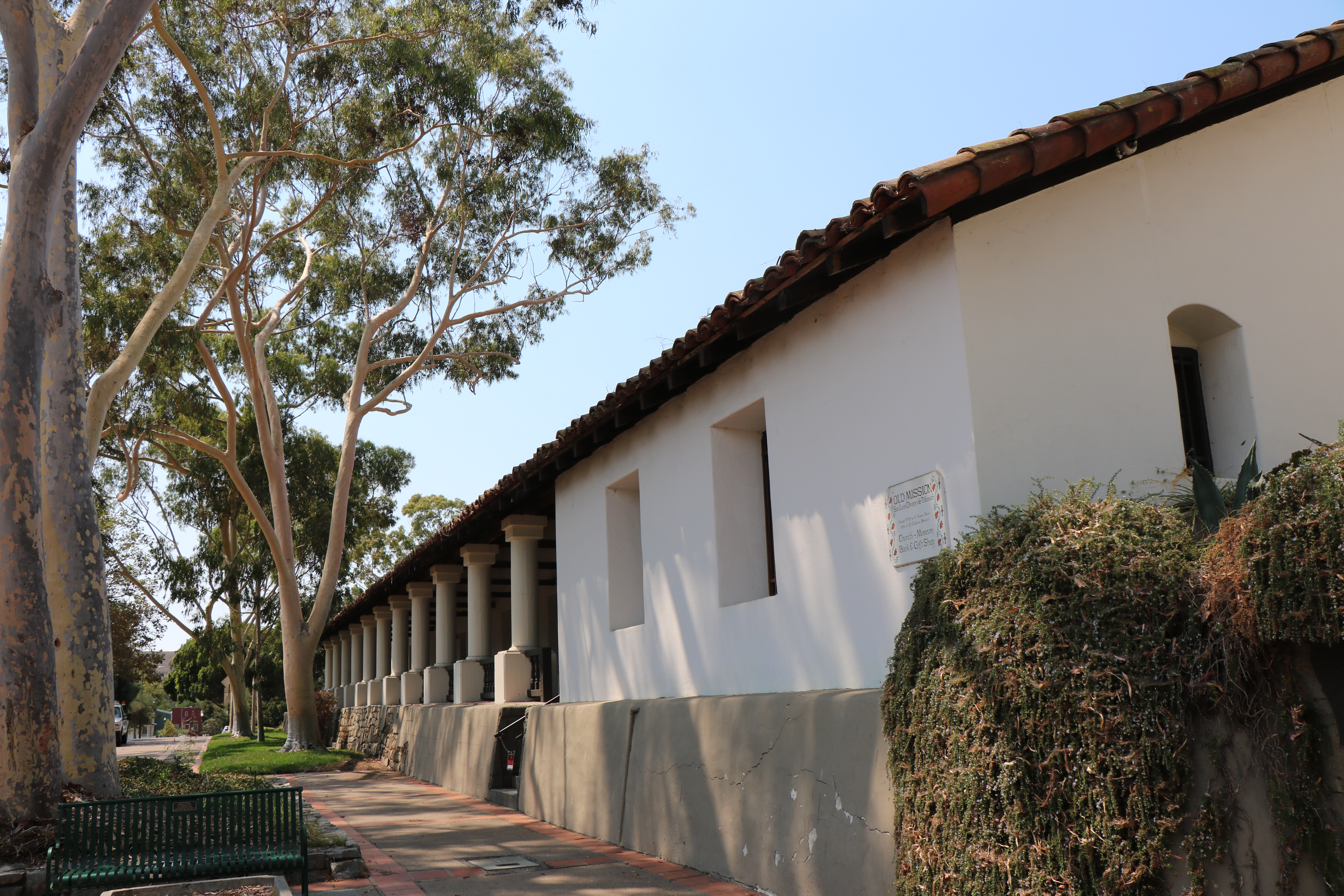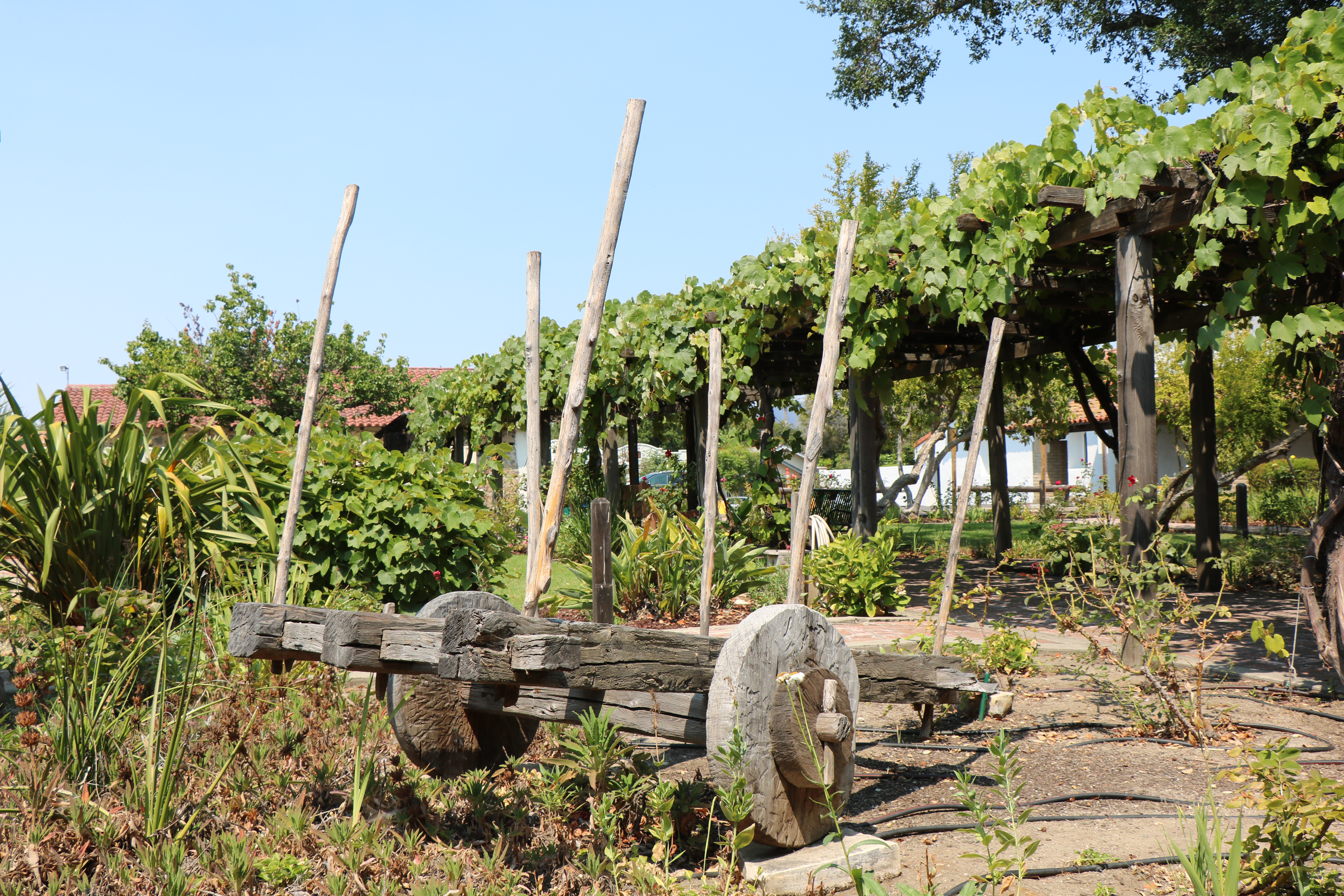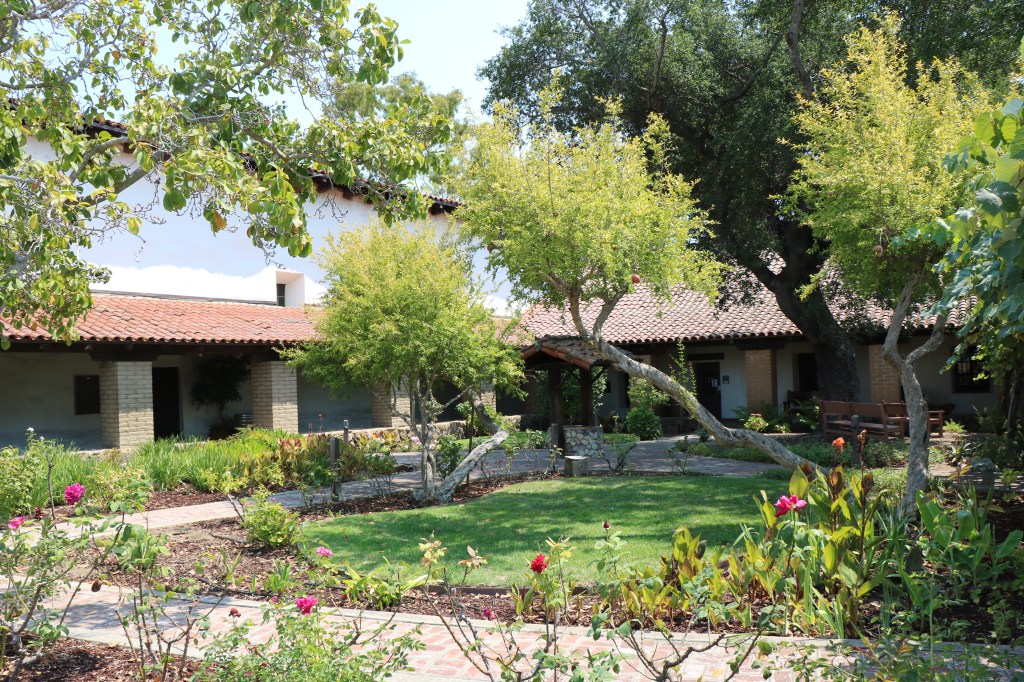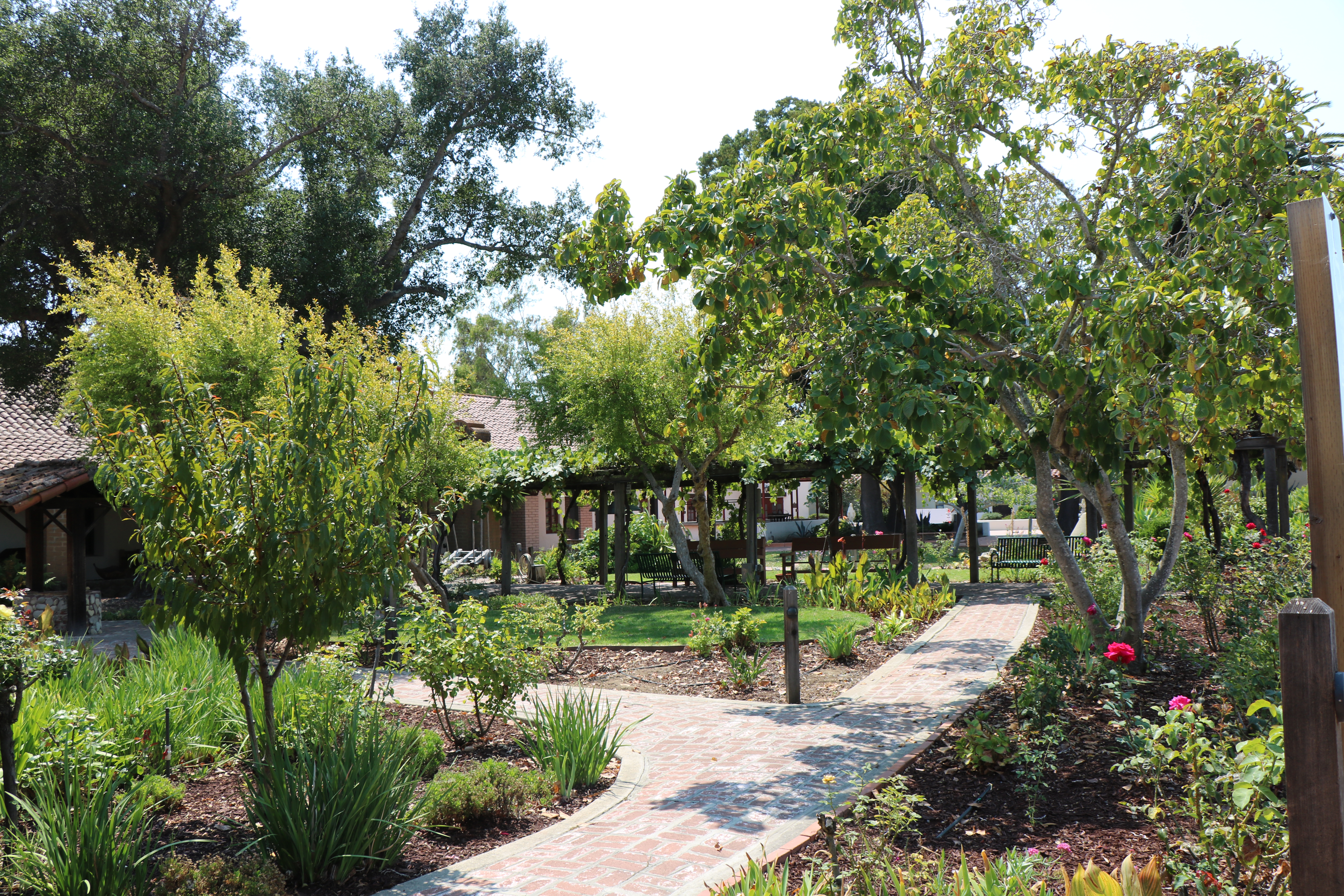 The mission garden is next to the museum and gift shop on one side, and the church on the other. Trees, roses and a variety of other plants line the path.