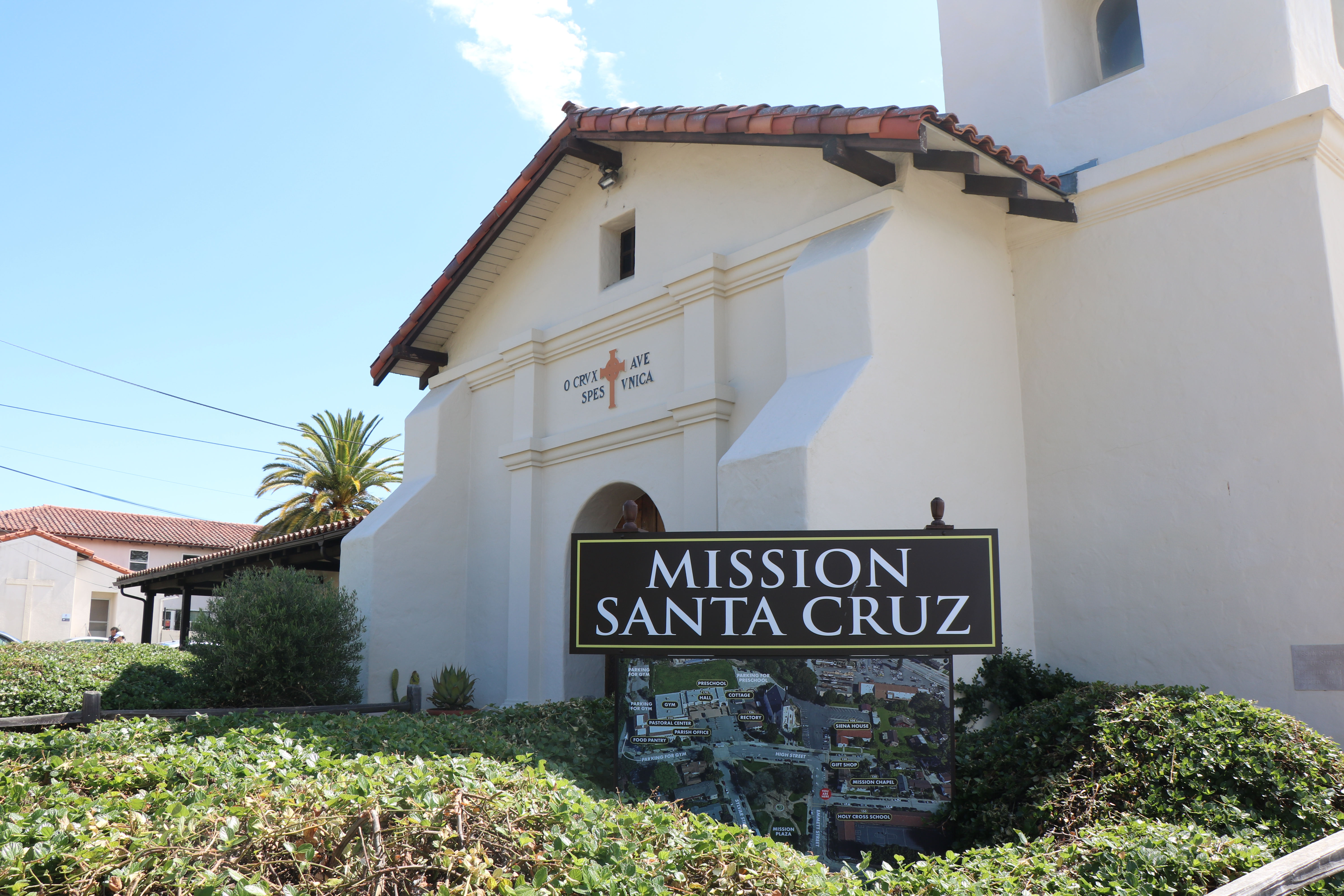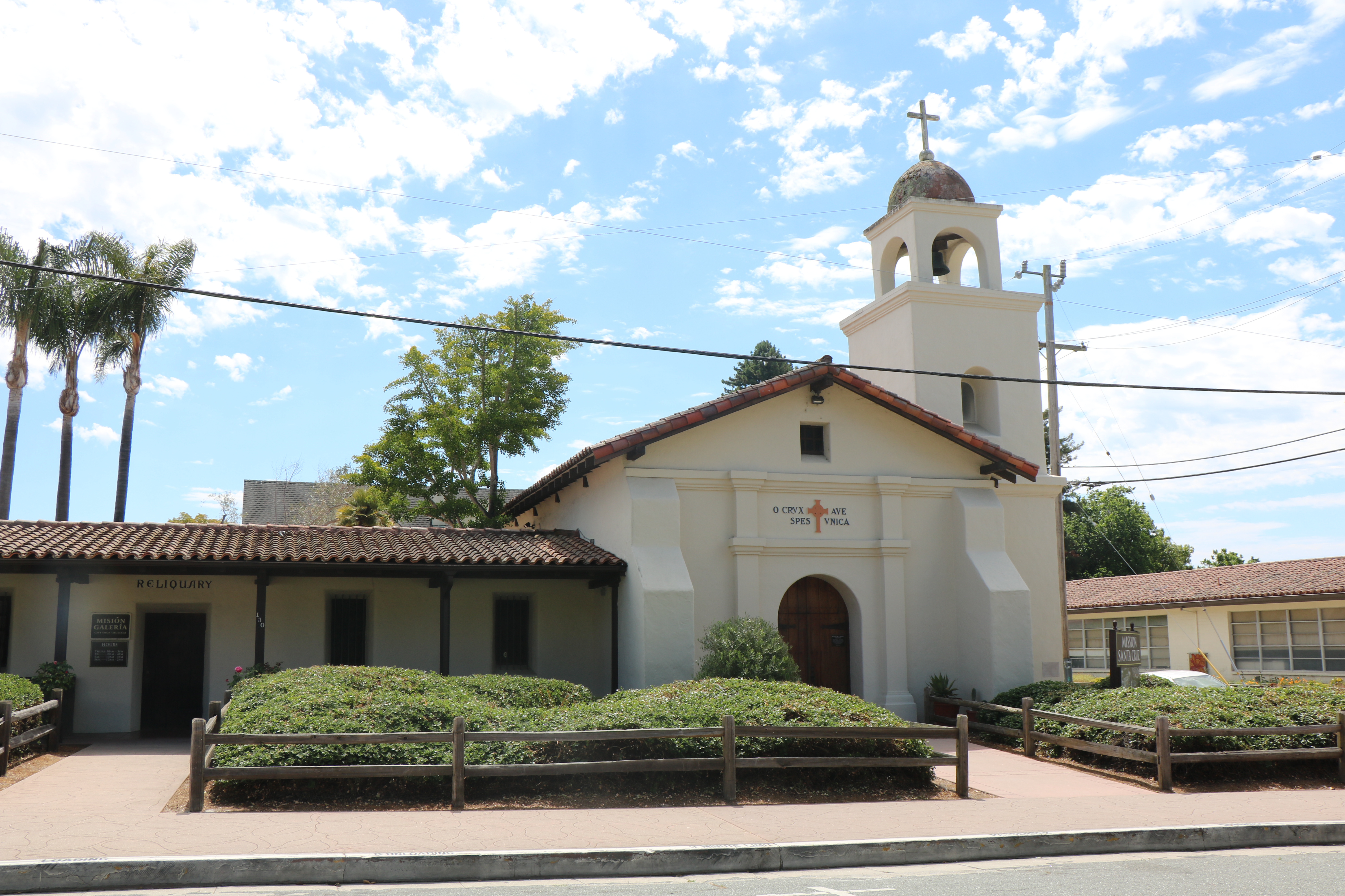 Except for the nearby adobe building, very little is left of Mission Santa Cruz. There is no convent and all the buildings of the quadrangle are gone. The Mission church is a replica of the 1795 church but is much smaller. Plan for a quick visit.